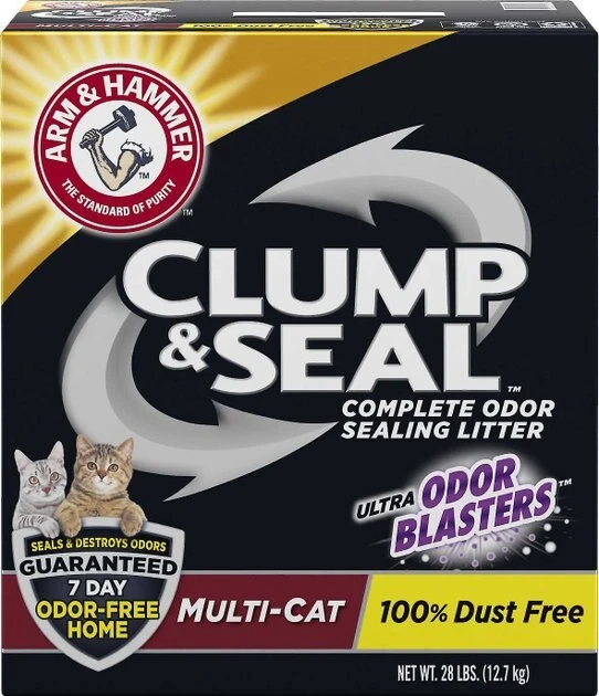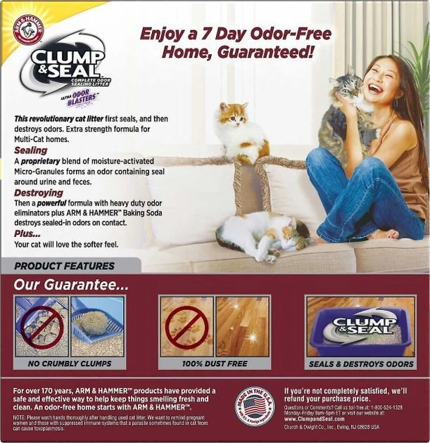 - Arm & Hammer Litter Clump & Seal Multi-Cat Scented Clumping Clay Cat Litter features a proprietary blend of moisture-activated micro-granules form a tight seal around odors while baking soda destroys sealed-in odors on contact.
