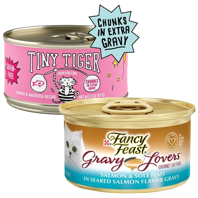 - Each purchase comes with Tiny Tiger Chunks in EXTRA Gravy Salmon & Whitefish Recipe Grain-Free Canned Cat Food, 3-oz, case of 24 & Fancy Feast Gravy Lovers Salmon & Sole Feast in Seared Salmon Flavor Gravy Canned Cat Food, 3-oz, case of 24.