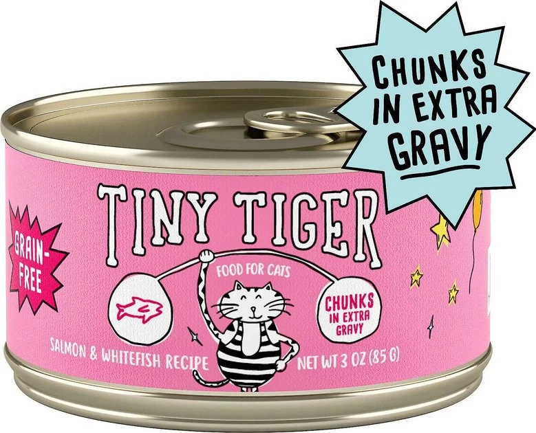 - Tiny Tiger Chunks in EXTRA Gravy Salmon & Whitefish Recipe Grain-Free Canned Cat Food provides high-quality animal protein for the amino acids needed to maintain lean, active muscles.